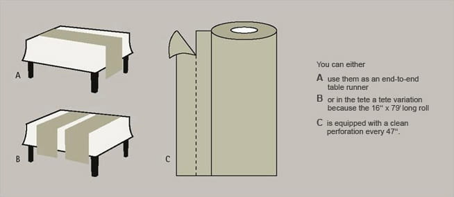 Możliwość wykorzystania produktu jako bieżnik rozwinięty przez kilka stołów, jak również jako obrus "tete a tete" dla dwóch osób przy jednym stole.